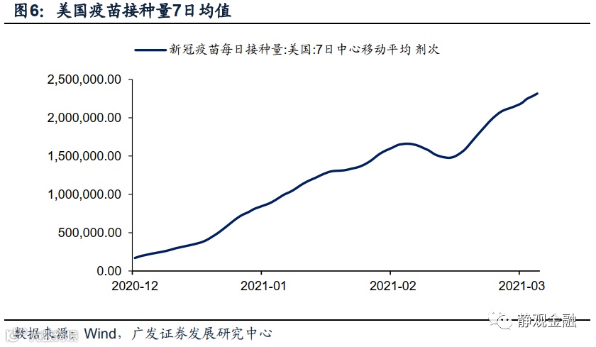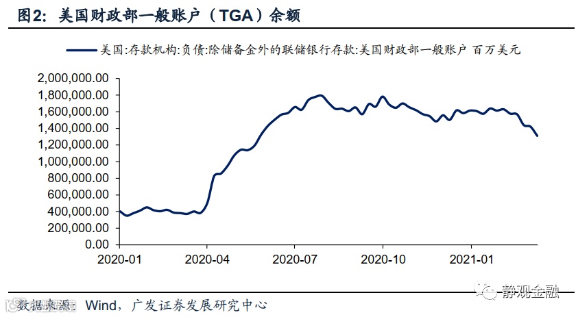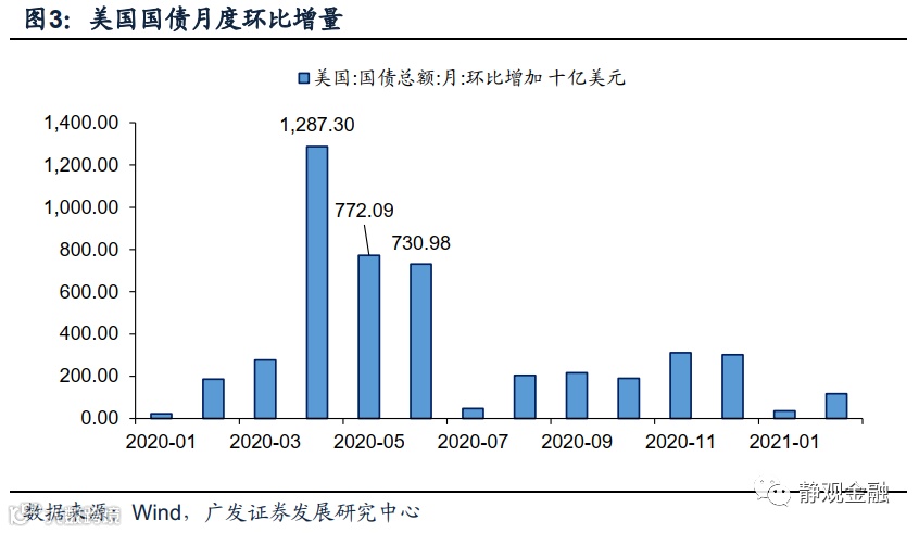 未来2-3个月美联储或暂时加大购债力度以支持第三轮财政抗疫刺激。金融危机以来美联储实施QE政策的目的之一就是帮助财政部压低国债发行成本以降低政府部门的债务利息支出。疫情以来美联储货币政策与财政政策共进退的原因也是如此。本月美国已落地第三轮抗疫刺激。尽管美国财政部在美联储的一般账户(TGA)余额仍高达1.3万亿美元,但与1.9万亿美元财政刺激相比仍有较大缺口并需通过发债填补。去年3月底的第一轮抗疫刺激(规模为2万亿美元)带来的国债供给脉冲持续至6月(图3),由此推断本轮财政刺激也将增加未来2-3个月国债发行压力。为降低国债发行成本,预计此间美联储将暂时加大购债力度。