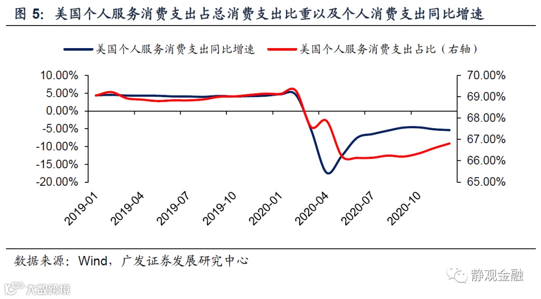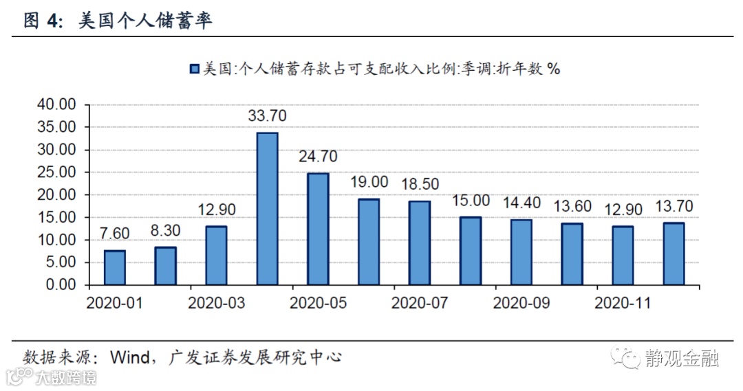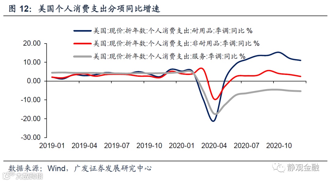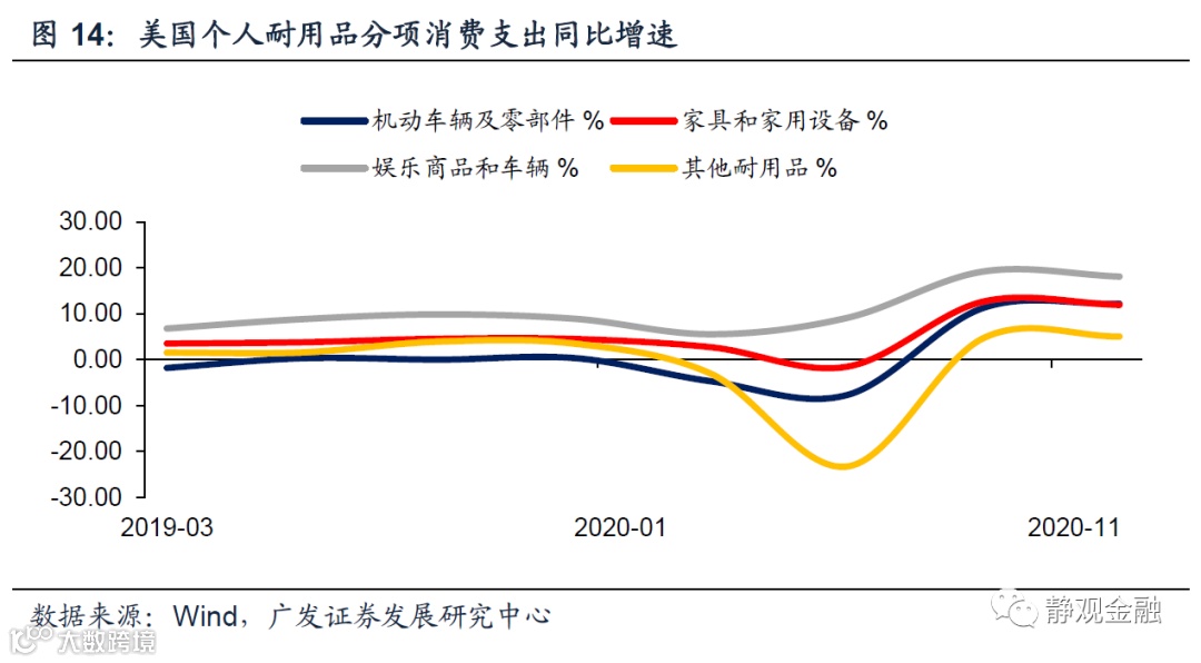 美国终端耐用品强劲需求或有三点基础:地产销售热、政府的转移支付以及疫情对服务消费的约束。首先,去年3月底以来美国已经实施了两轮纾困刺激,除了直接派发现金外还有上调了失业金,因此美国居民收入并未受损,并且储蓄率大幅攀升。其次,疫情暴发前在美国个人消费支出中66%为服务消费,疫情暴发后这部分需求显著受损,影响了美国居民的消费结构。最后,正如我们2020年12月11日报告《美国地产:周期拐点还是昙花一现?》中提到的,用新屋销售同比增速衡量的2020年H2美国地产销售景气度创出了1984年以来最佳,由此美国地产后周期的进口需求强劲。