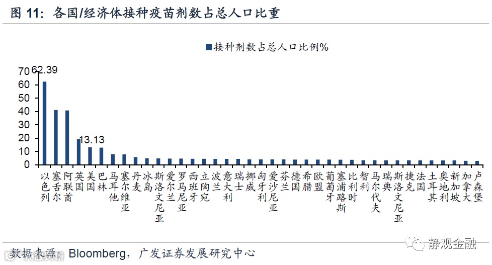 由表8可知,美国是2020年中国出口的主要拉动国。此外,由前文可知,美国对中国出口拉动主因在需求;其余多数贸易伙伴对中国的出口拉动则多与替代有关。由此可见,展望2021年中国出口结构甚至亮点仍要从美国的需求及非美的供给着手。由图11可知,目前全球主要经济体疫苗接种剂数仍较为有限,即便是美国实现群体免疫也要等到Q3左右,对于全球主要生产国而言实现群体免疫的时点或更晚,因此海外供给仍在恢复中,但节奏上并不会一蹴而就,对中国出口或有边际影响、但应该较为缓慢。因此未来半年中国出口结构及亮点或主要看美国需求。