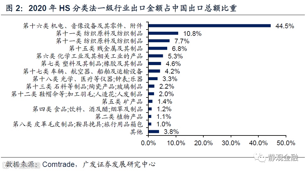首先,2020年出口金额占中国全年出口总额比重超过2个百分点的HS分类法一级行业包括第十六类(机电、音像设备及其零件、附件),占比44.5%;第十一类(纺织原料及纺织制品),占比10.8%;第二十类(杂项制品),占比7.7%;第十五类(贱金属及其制品),占比6.8%;第六类(化学工业及其相关工业的产品),占比5.3%;第七类(塑料及其制品,橡胶及其制品),占比4.6%;第十七类(车辆、航空器、船舶及运输设备),占比4.2%;第十八类(光学、医疗等仪器,钟表,乐器),占比3.3%;第十三类(石料、石膏、水泥、石棉、云母及类似材料的制品,陶瓷产品,玻璃及其制品),占比2.2%;第十二类(鞋帽伞等,已加工的羽毛及其制品,人造花,人发制品),占比2.0%。