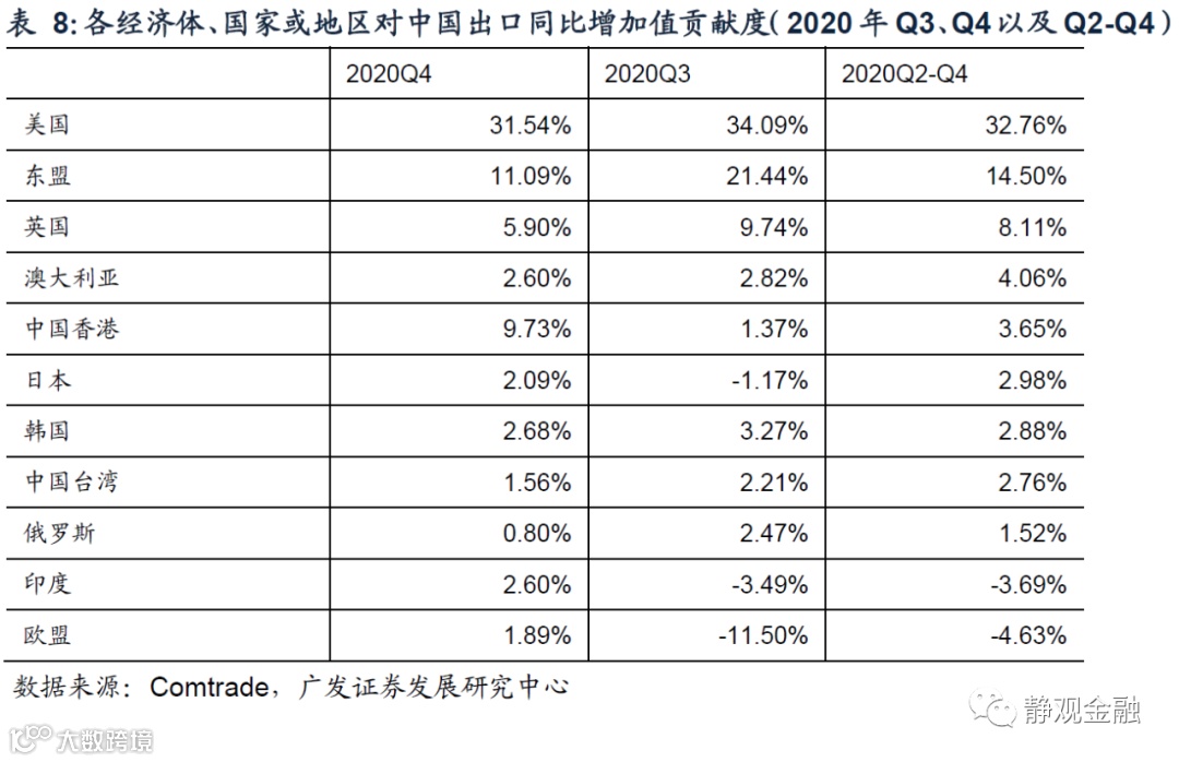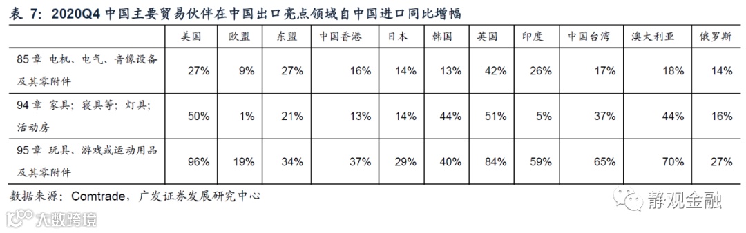 综上所述,可以得到三点结论:Q2中国抗疫相关的医疗物资出口以及Q2-Q3纺织服装出口强劲皆因境外需求驱动;Q3-Q4中国地产后周期在全球范围内的强劲出口既有需求驱动亦与贸易伙伴生产受限有关;Q3-Q4美国(或包括东盟)对中国出口的拉动多与需求有关、其余贸易伙伴对中国出口的拉动则多与出口替代或者本土生产受限有关。换言之,2020H2美国(或许包括东盟)的需求对中国出口形成拉动,其余贸易伙伴对中国出口拉动更多地体现为出口替代或者本土供给不足。此外,2020H2中国出口亮点基本为终端耐用品,地产后周期等格外突出。