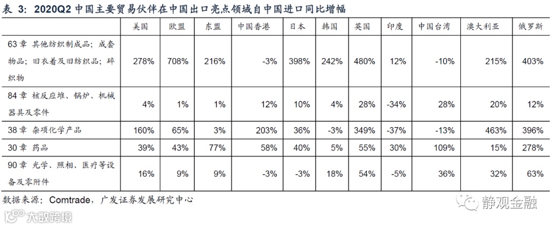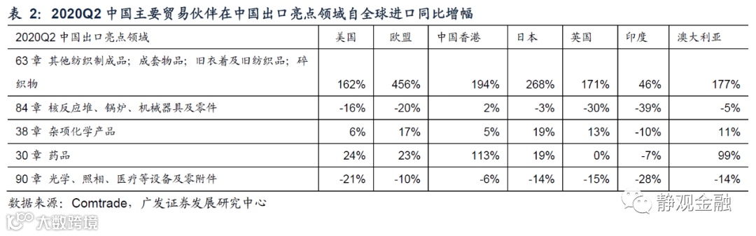 假若我们观察HS分类法下的二级行业数据可以获得更加明确的信息。Q2对中国出口同比增加值形成显著拉动的二级行业分别是第63章(其他纺织制成品,成套物品,旧衣着及旧纺织品,碎织物)、第84章(核反应堆、锅炉、机械器具及零件)、第38章(杂项化学产品)、第30章(药品)以及第90章(光学、照相、医疗等设备及零附件)。显然,Q2中国出口亮点在纺织衣物及抗疫物资方面,与海外疫情仍处发酵期有关。