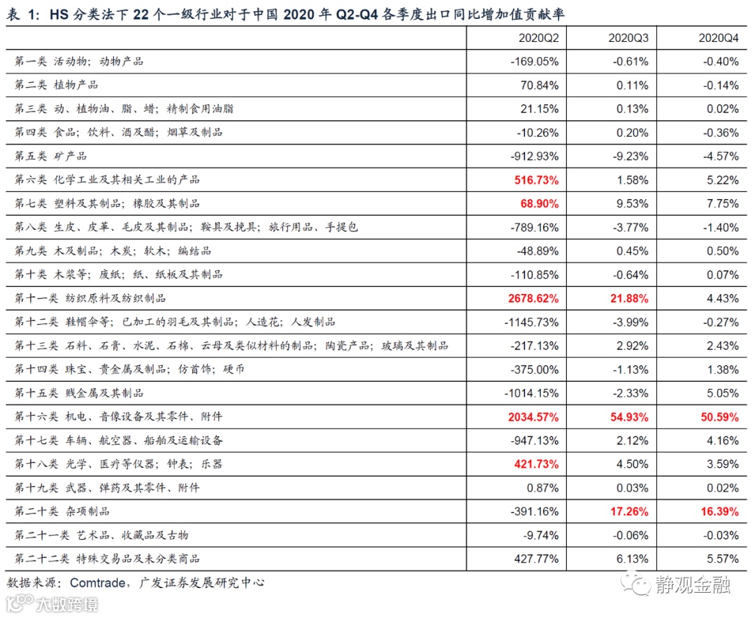 与2019年相比,2020年四个季度中国出口同比变化极大。Q1还是2009年后最差水平,Q2已经开始修复,Q4中国出口金额同比增加值(1121.05亿美元)已创出10年新高、同比增速(16.66%)也为2013年Q2后新高。通过HS分法下一、二级行业贸易数据,我们可以得到2020年Q2-Q4中国的出口亮点。