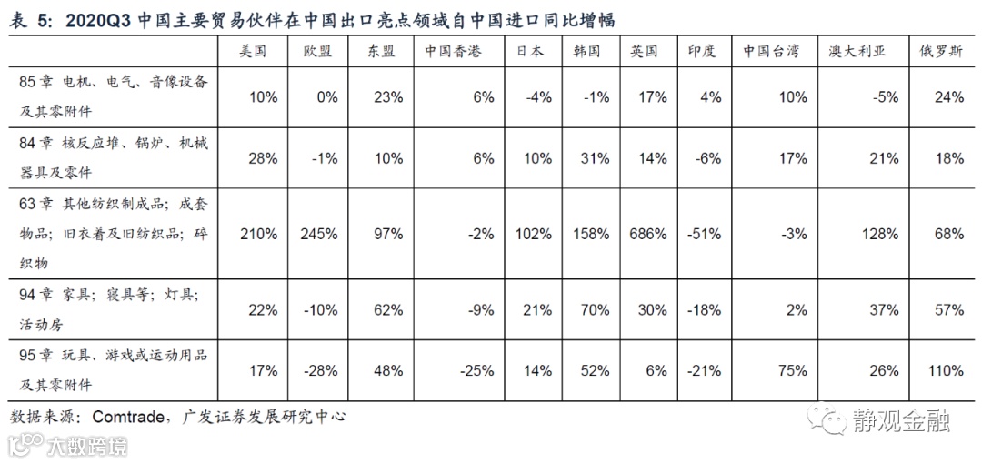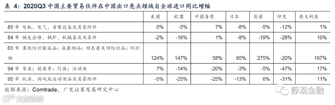 Q3对中国出口同比增加值形成显著拉动的二级行业分别是第85章(电机、电气、音像设备及其零附件)、第84章(核反应堆、锅炉、机械器具及零件)、第63章(其他纺织制成品,成套物品,旧衣着及旧纺织品,碎织物)、第94章(家具,寝具等,灯具,活动房)、第95章(玩具、游戏或运动用品及其零附件)。也就是说与Q2相比,Q3中国出口亮点向地产后周期(第85章、第94章)以及疫情居家生活相关的耐用品(第85章及第95章)延伸、同时抗疫物资需求下降。
