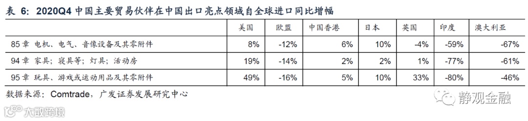 美国实现群体免疫的节奏会显著快于其他海外大国,由此可见今年美国在类似玩具、游戏等疫情居家的消费需求将明显弱于去年下半年。去年Q3-Q4中国出口亮点之一的玩具、游戏或运动用品及其零附件在今年对中国出口的影响或将转平甚至转负。