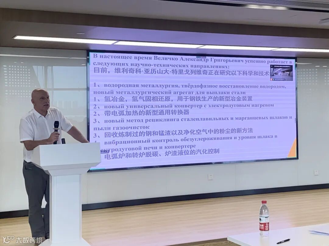 湖州市吴兴区核源金属新材研究院院长亚历山大•维利奇克VELYCHKO OLEXANDR向参会企业介绍其在冶金行业的节能环保新工艺科研成果,如用于钢铁生产的新型冶金装置、带电弧加热的新型通用转换器、回收炼制过的钢和锰渣以及净化空气中的粉尘的新方法等。其中,由维利奇克开发的氧气精炼转炉现在正在中国的三家工厂生产,并成功生产不锈钢。
