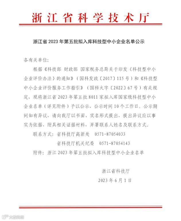 浙江省2023年第5批拟入库科技型中小企业名单公示企业清单