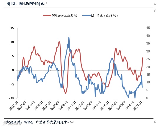 货币周期经验上领先工业品价格、盈利周期。我们在前期报告《关注趋势性—2021年通胀环境展望》中提到:①以M1代表国内信用/货币脉冲,实际上M1见底实体层面一般同步于地产销售周期、乘用车零售周期启动,即M1上行-->隐含地产周期扩张下的信用派生过程。另一方面从地产销售至投资端的传递过程来看,滤波法下的M1波动项大致领先PPI的规律依然成立。②社融对企业盈利存在领先关系,间接拉动通胀走高。国内信用环境改善通常伴随银行风险偏好修复与资产负债表脱虚向实,企业盈利投资、预期回报率显著回升,通胀中枢受企业投资活动带动走高。