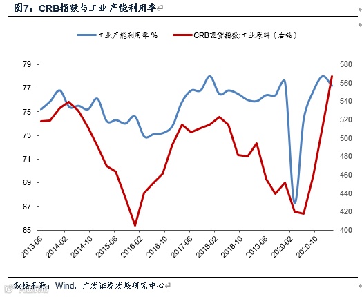 制造业库存周期虽然较为波折,但整体存在补库存效应:国内方面,2019年四季度以中美达成第一阶段贸易协议为起点,国内产成品库存同比触底回升。去年2-3月受疫情突发影响企业被动累库,同期CRB指数大幅回落。4-6月国内防疫形势日渐明朗,出口、建筑链以及工业秩序逐步恢复,企业被动累库斜率放缓。今年以来伴随海外经济复苏、疫苗接种进度加快,国内制造业正式进入主动补库阶段,CRB原材料中枢阶段性走高。