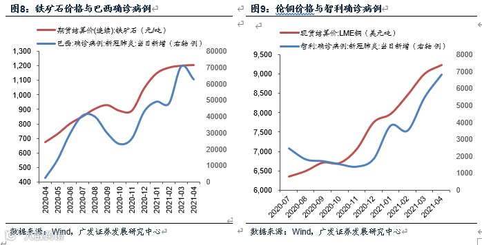 南美资源国疫情导致大宗品供给受影响。2月第三周至今,智利月度日均新增病例由3518例迅速增至4月6824例;巴西月度日均新增病例增至4月的62881例。作为全球最大的铜矿与铁矿石供给区域,智利、巴西等主要产地受制于疫情反复,运力受阻将影响工业原材料供给、流通等诸多环节。去年四季度至今对应大宗品价格与南美资源国新增病例相关性较高。