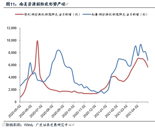 第二,资源国疫情反复扰动。海外疫情反复依然对工业原材料流通、运输及供给环节形成约束。截止4月末,智利当周日均新增病例为5654例/日,秘鲁当周日均新增确诊病例为6744例/日,去年年底两国日均新增病例数分别为2149例/日、1449例/日。