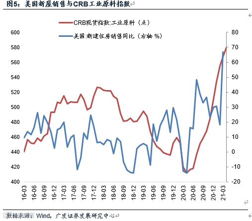 中美同步出现一轮地产销售周期。疫后美国地产基本面迅速反弹,房屋开工与销售季调折年数录得2007年以来新高。地产销售强劲反弹下目前美国住宅库存低、库销比尚属低位,截止今年2月美国挂牌成屋去库存周期为历史最低水平。整体而言,低库存高房价叠加高景气度的格局将持续刺激开工,进而推动近期大宗商品价格上涨。国内地产开年数据亦显著偏强。截止今年2月全国商品房销售面积同比增长64%,即使考虑到基数,这一数据也是显著偏高的。4月30城商品房成交日均57万方,同比增长37.5%,相较19年同期增长10.7%。其中一二线城市销售景气度显著偏高。整体而言中美地产周期景气对原材料价格形成支撑。