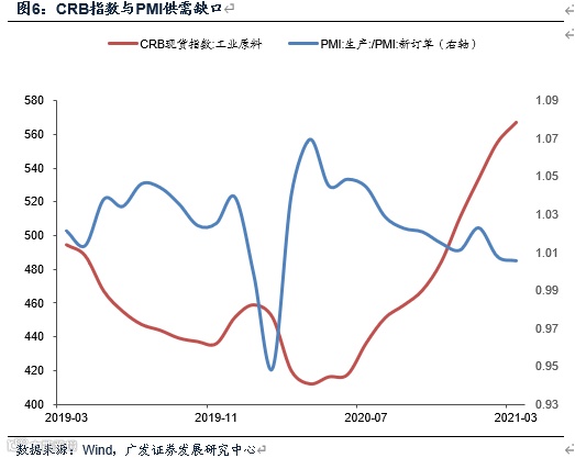 第三,国内修复斜率度过增速最高阶段。今年外需存在欧美疫苗接种推进和经济正常化的支撑,国内疫苗接种亦会逐步释放服务业斜率,因此宏观经济偏景气虽为大概率,但不能完全排除制造业景气度过斜率最快阶段。当前工业原材料价格上行较快,导致中下游工业成本承压,部分企业存在原材料价格约束下的利润压力。