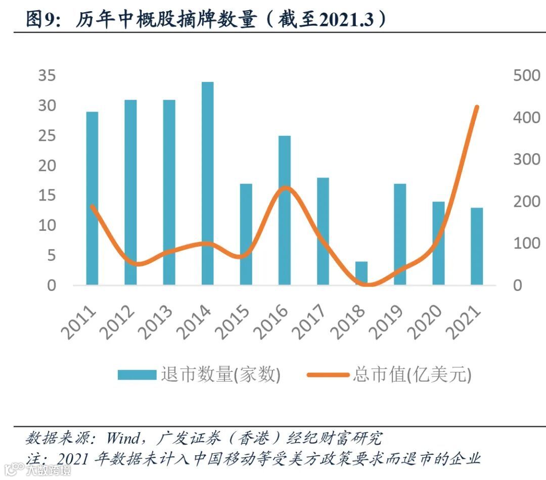 2014-2016年,中概股也曾掀起一波“回归热”,其中2016年美股退市企业的总市值超过了230亿美元(图9)。不过,两次热潮中回归的主体、形式、政策的支持和外部环境等方面皆存在显著差异。