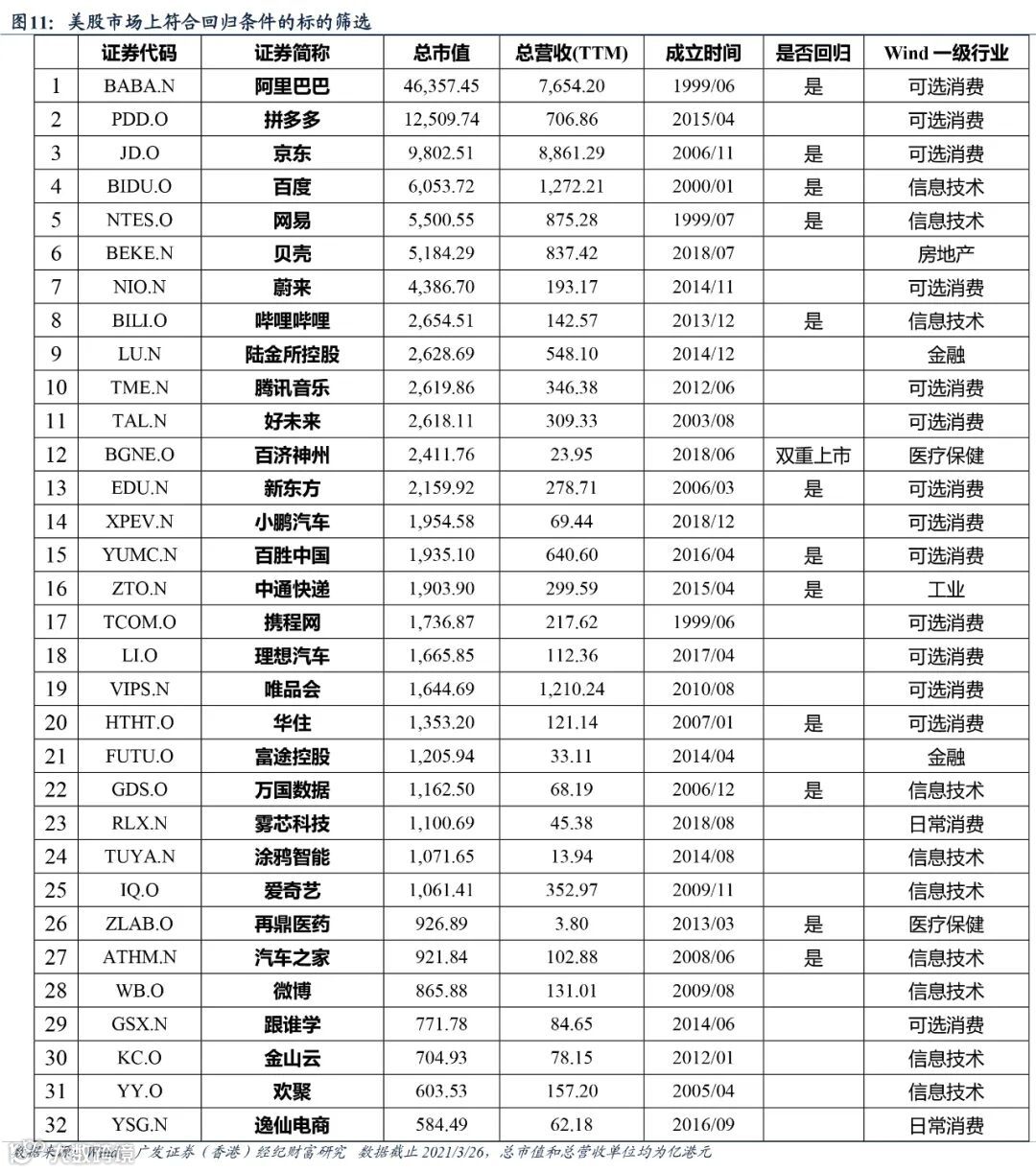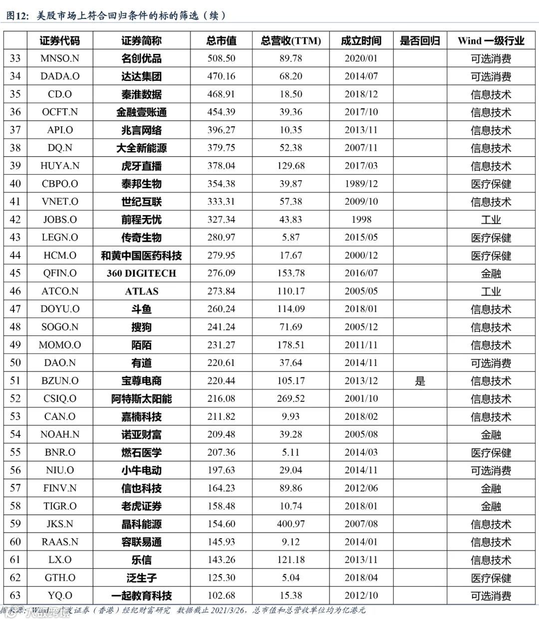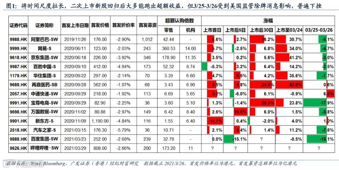 (一)大市的投资气氛都比较低迷:去年的6月、9月,以及阿里回归的2019年11月,都属于地缘政治风险升温、市场风险偏好低迷、大市走势震荡的时期。而今年3月亦是处于自从2月份高位回落后的调整时期。在这种状态下,优质中概股的回归能对市场起到“稳定军心”的作用。另一方面,二次挂牌的公司在上市之时的估值也不至于太贵(部分公司甚至因为风险事件,挂牌后出现破发),也为投资提供了更加充足的安全边际。
