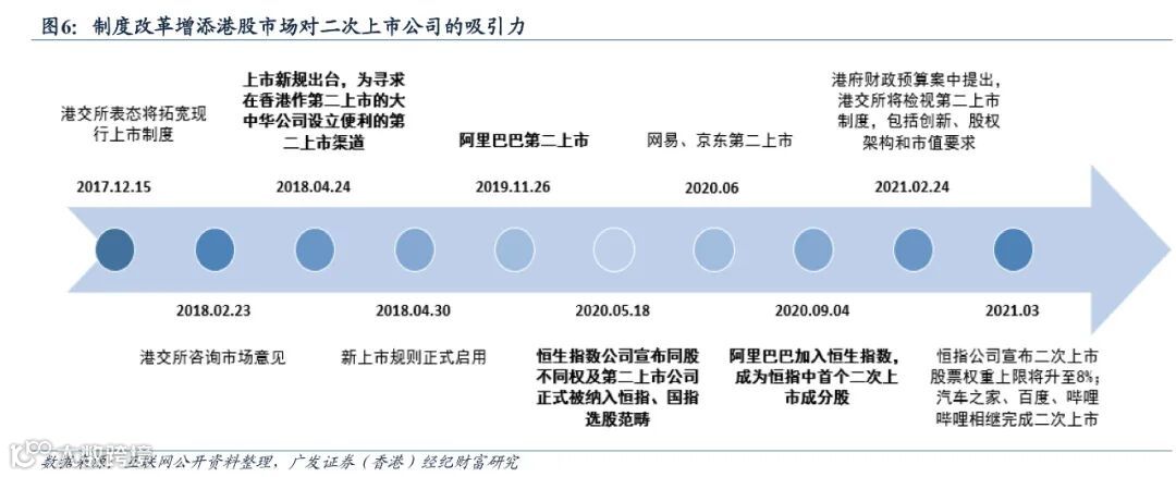 4. 制度改革的红利仍在持续释放:2018年港交所上市新政的推出大大简化了二次上市公司的挂牌流程,筹备回归的公司可秘密交表,聆讯前无需在联交所网站公布具体信息,而通过聆讯后到上市的时间也被大幅缩短——阿里巴巴、网易和百度仅耗时约10个工作日。与此同时,二次上市公司的待遇也不断优化:去年9月恒指公司开始允许将二次上市的成分股纳入恒生指数之中,今年3月的改革更是将权重上限提高到与全市场一致的8%。这种“一视同仁”的处理态度有助于进一步增强香港市场的吸引力。