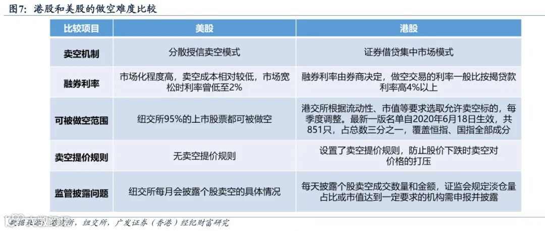 5. 港股做空的成功率低于美股:美股做空交易的市场化程度高,资金成本低、可选取标的范围大、手段多元、机制方便、监管松散。事实上,由于做空难度太低,大量机构加杠杆参与其中,部分标的卖空的比率甚至已经超过了流通的市值,这也为今年一月GME的“史诗级”散户逼空埋下了伏笔。