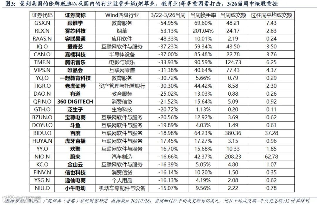 拜登上台之后,市场普遍预期中美关系能得到改善,美国政府也会搁置这一法案。然而,自1月以来,一系列针对中概股的限制措施并未放松:中海油仍然完成了退市程序,针对所谓涉军企业(小米、箩筐技术)的制裁也还处于争持的状态之中。3月份,美国证监会更是出台了修正案,开始逐步推动《外国公司问责法案》中措施的落地,这一消息也使得近期中概股出现了剧烈波动,市场成交额显著放大(图3):其中,刚刚完成回归的百度在3月26日单日即成交1600亿港元,成交额已经接近港股全日的平均水平。