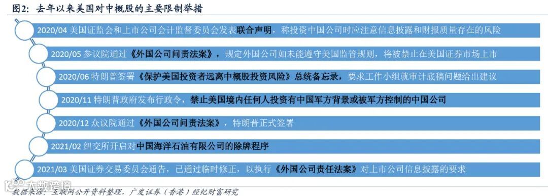 4. 美国资本市场监管政策的变化是促成中概股回流的直接原因和催化剂。自2019年以来,“金融脱钩”就已经成为美国在贸易谈判中的砝码之一。在去年5月两国对抗升温之时,美国国会参议院通过了旨在针对中概股的《外国公司问责法案》。其中,主要的争议点在于美国公众公司会计监督委员会(PCAOB)能否获得中国企业审计底稿,以及中国企业与政府关系的披露之上,双方迟迟难以达成一致。去年12月,该法案又经过众议院一致通过,特朗普签署后正式生效,成为了悬在中概股头顶的“达摩克利斯之剑”——一旦无法满足审计要求,就要面临从美股退市的风险。