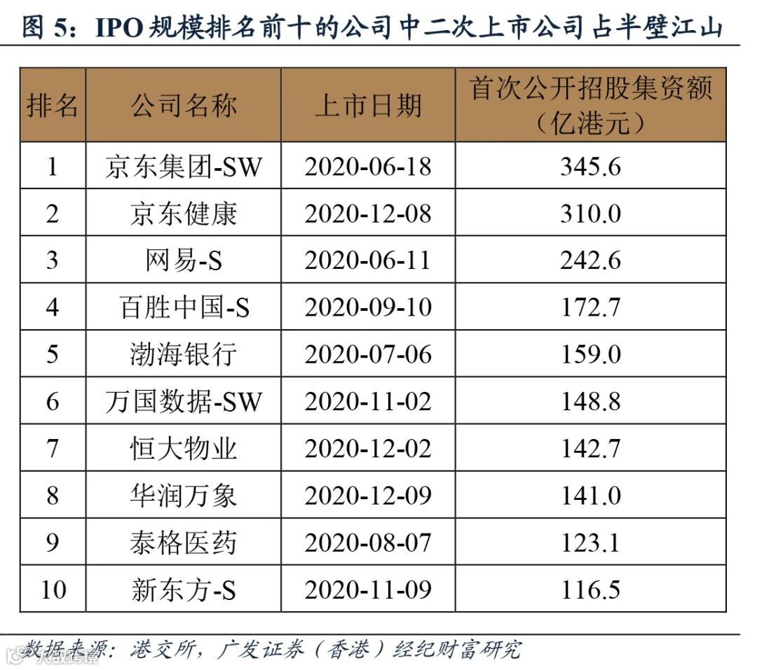 2. 香港市场具备强大的融资能力:2020年香港是全世界第二大IPO市场,全年公开招股集资额达到近4000亿港元。其中,融资额里来自于内地新股的占比已经达到了99%,包括9家二次上市企业(共1300亿港元),京东集团-SW排名全年募资额的首位。总的来看,由于回归的中概股大都属于优质的行业龙头,已在美股市场拥有可追溯的业绩记录,港股投资者的认可度整体较高。