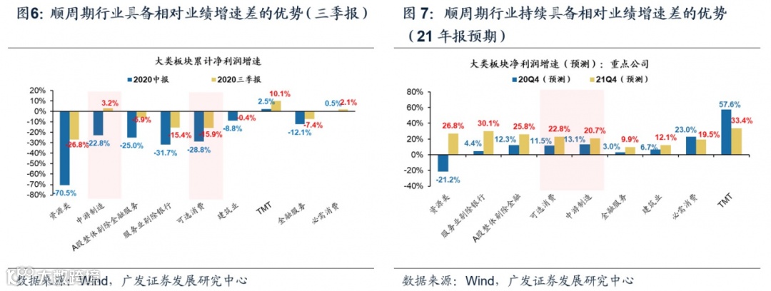 (四)顺周期板块盈利(预期)持续改善,年末“估值切换”将进一步加持“估值降维”:从中游制造到可选消费。11月31日上市公司全部披露了三季度财报数据,我们在当天发布的三季报速览《盈利继续回暖,单季同比转正》中指出:整体上来看,A股三季报业绩加速好转——非金融Q3累计净利润同比增速大幅回升19.1pct到-5.92%,单季净利润同比增速大幅回升33.4pct到31.9%(由负转正),单季净利润环比增速25.8%创03年以来历史新高(是历史第二高的两倍多)。结构上来看,三季报顺周期板块的“相对业绩增速差”优势扩大,其中,中游制造的业绩改善幅度远大于可选消费,成为三季度“估值降维”的主要方向——三季报主要板块的业绩加速幅度分别为:顺周期的中游制造(26.0pct)>可选消费(12.9pct)>逆周期的TMT(7.6pct)>必需消费(1.7pct)。另一方面,从分析师重点跟踪公司的盈利预期来看,21年顺周期板块的“相对业绩增速差”仍将优于逆周期板块,不过,可选消费的业绩改善幅度将超过中游制造——主要板块21年报预期业绩(相对20年报)的加速幅度分别为:顺周期的可选消费(11.3pct)>中游制造(7.7pct)>逆周期的必需消费(-3.4pct)>TMT(-24.1pct)。我们认为,可选消费景气(预期)改善提速,将是下一阶段“估值降维”的重要方向,同时,可选消费行业21年报较高的(预期)盈利增速弹性,也更容易诱发年末“估值切换”,进一步加持“估值降维”从中游制造向可选消费“接力演绎”。