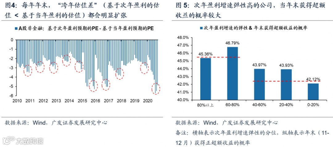 (三)年末的“跨年估值差”扩大,次年(预期)盈利增速弹性高的板块更容易发生“估值切换”。接近年末,投资者会同时基于当年/次年的盈利对企业估值,由此带来的“跨年估值差”(基于次年盈利的估值 < 基于当年盈利的估值),往往会诱发年末发生“估值切换”——我们以分析师重点跟踪公司(有5家及以上机构出具当年/次年预期净利润)为样本,构建基于当年/次年(预期)净利润的两套动态估值体系,可以发现:由于投资者在年末的时候往往会高估次年的预期净利润,导致基于次年盈利的估值会明显低于基于当年盈利的估值(下图3),带来年末“估值切换”。进一步分析可以发现,次年(预期)盈利增速弹性高的板块更容易发生年末“估值切换”——年末“估值切换”的本质在于,每年年末(尤其是11月基金年度考核完成前后)布局次年(预期)盈利增速高弹性且估值相对较低的板块,因为这些板块的“跨年估值差” (基于次年盈利的估值 < 基于当年盈利的估值)往往也相对更大。2010年以来的经验数据也印证了这一判断:次年(预期)盈利增速弹性高的板块(60为数以上),在年末获得超额收益的概率显著高于次年(预期)盈利增速弹性低的板块(60分位数以下)。