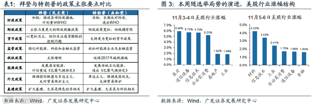 大选投票当日(美国时间11月3日)晚间特朗普局势暂时领先、而在随后(美国时间11月4日凌晨至6日)拜登优势再度扩大,美股表现在此期间均有上涨且结构差别不大,海外投资者因不确定性下降risk-on、且当前更多交易“拜登胜选+分裂国会”的情形:从特朗普与拜登的主要政策主张的差异来看,特朗普胜选将推动更大规模的宽松、实施减税、主导科技如5G领域的基建等,美股科技股更为受益;而拜登主导更大规模的财政刺激将对顺周期及清洁能源等领域更友好、但加税及强监管或对科技及金融领域不利。从美股3-6日的行业表现来看,顺周期和科技股均有上涨,这表明海外risk-on的同时,一方面接受拜登政策里对财政加码的预期(材料、工业等顺周期领涨);另一方面偏向分裂国会情形,即美股表现对拜登政策中加税和强监管的担忧不足(科技股亦有亮丽表现)。在当前大概率的“拜登胜选+分裂国会”情形下,将有利于全球经济预期的进一步修复。