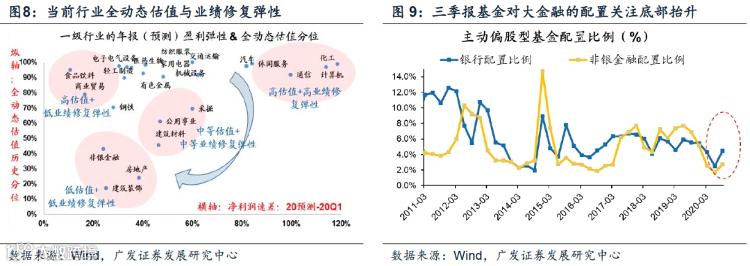 回顾我们下半年推荐的主要脉络。阶段一:Q2工业生产率先修复,市场“估值降维”沿着 率先补库 /扩产与需求改善共振的中游制造业展开;阶段二:下游可选消费行业 Q3-Q4改善趋势有所提速,一是库存消化及外需持续改善的汽车、家具、家电,二是交互限制进一步放开的休闲服务、航空。 展望下一阶段,随着顺周期阿尔法的估值修复,“估值降维”有望继续下沉至下一象限,关注景气拐点确认、动态估值低分位、基金三季报配置关注底部抬升的大金融(银行/保险)。