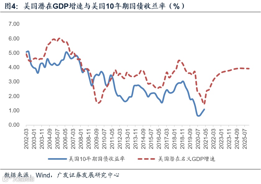 按照美国国会预算办公室的测算数据,美国本轮潜在名义增长率的底部是2021年一季度(1.46%),2021年底将上行至2.82%,2022年底将上行至3.62%。