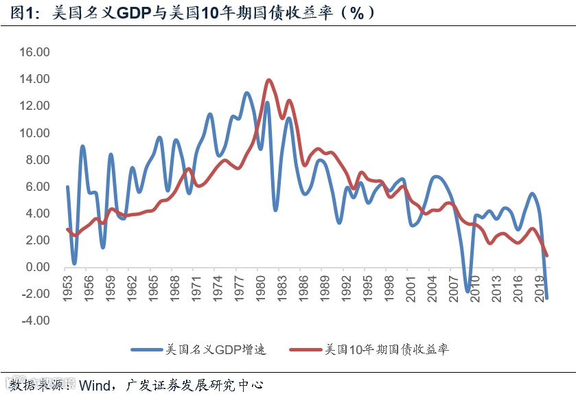 过去70年美国10年期国债收益率形成了一个“倒V”型,即前三十年震荡上行、后40年震荡下行,这是由美国名义GDP的走势决定的。