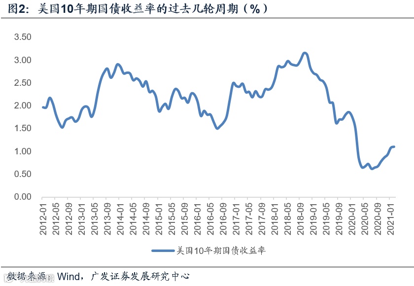 第二,除趋势性外,美国10年期国债收益率还有短周期性。过去几轮周期分别是2012年中-2013年底上行、2013年底-2016年中下行、2016年底-2018年中上行、2018年底-2020年中下行。