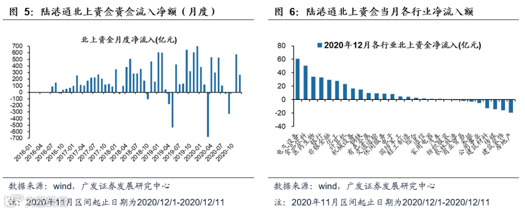 (5)陆港通北上资金流入净额:上周陆股通北上资金净流入70亿元,前一周净流入245亿元。截止2020年12月11日,2020年12月北上资金净流入268.72亿元,净流入前五名行业是电气设备、食品饮料、医药生物、银行、非银金融,净流出行业前五名是房地产、建筑装饰、传媒、建筑材料、公用事业。