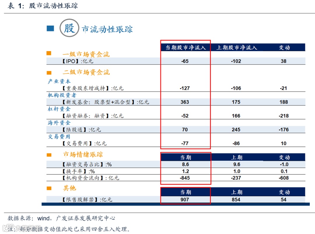 二级市场:上周在北上资金流入等的带动下,A股二级市场整体呈现净流入。流入方面,上周国内基金(股票+混合)新发行363亿元,北上资金流入70亿元,两融融资余额下降52亿元;流出方面,重要股东减持127亿元,交易费用77亿元。