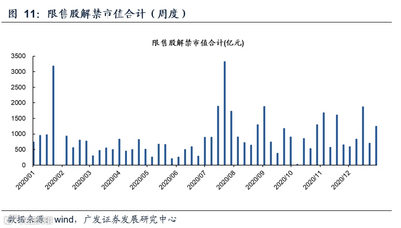 (1)限售股解禁:上周限售股解禁907亿元,前一周限售股解禁854亿元。预计本周限售股解禁1911亿元(以2020年12月11日收盘价计算)。