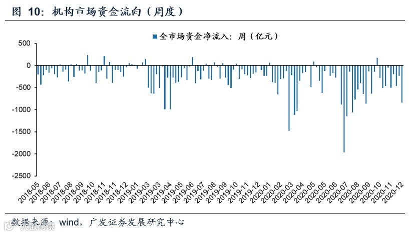 (3)机构资金流向: 上周机构合计挂单卖出845亿元,前一周挂单卖出237亿元。