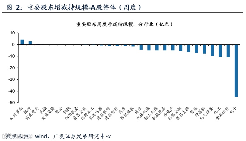 (2)重要股东增减持(A股整体): 本周重要股东减持127亿元,前一周净减持约106亿元。本周增持规模前三的行业为公用事业、银行、商业贸易,减持规模前三行业为电子、食品饮料、化工。