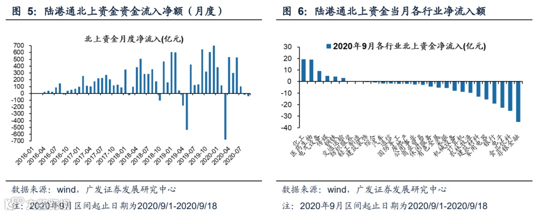 (5)陆港通北上资金流入净额:上周陆股通北上资金净流入108亿元,前一周净流出6亿元。截止2020年9月18日,2020年9月北上资金净流出40亿元,净流入前五名行业是化工、医药生物、电气设备、传媒、钢铁,净流出行业前五名是非银金融、食品饮料、电子、银行、家用电器。