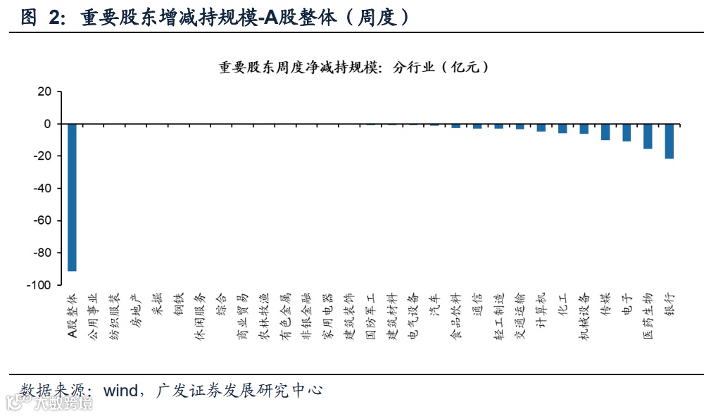 (2)重要股东增减持(A股整体):上周重要股东净减持约91亿元,前一周净减持约142亿元。其中增持规模前三的行业为公用事业、纺织服装、房地产;减持规模前三行业为银行、医药生物、电子。