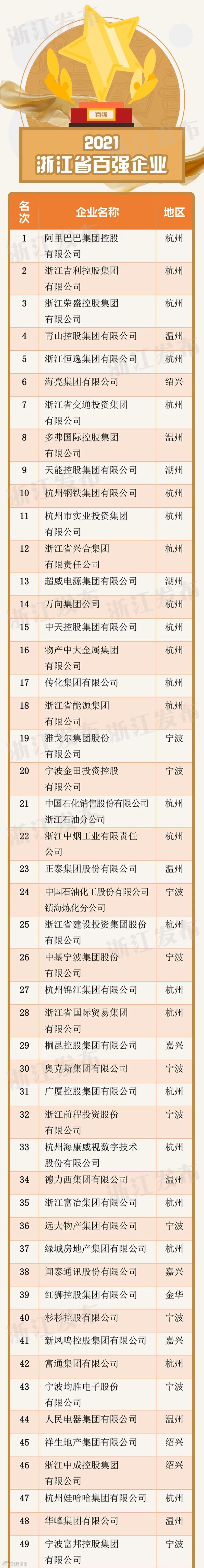 2021浙江省百强企业榜单显示:营业收入超过千亿元有20家企业,与上年持平。排名前三位的分别为阿里巴巴集团(7172.89亿元),浙江吉利控股集团(3256.19亿元)、浙江荣盛控股集团(3086.09亿元)。