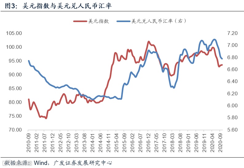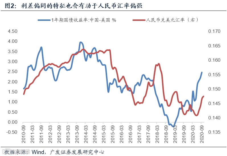 美元作为全球资产的定价锚之一,受风险溢价的影响较大。疫情发生后全球避险情绪上升,美元指数走强,对应这个阶段人民币兑美元贬值;二季度末开始全球经济修复预期上升,风险溢价下降,资金流出美元资产,美元指数走低,对应这一阶段人民币相对走强。目前整体来说还在后一轮趋势中。美国大选选情可能也带来了一定程度的短期影响。