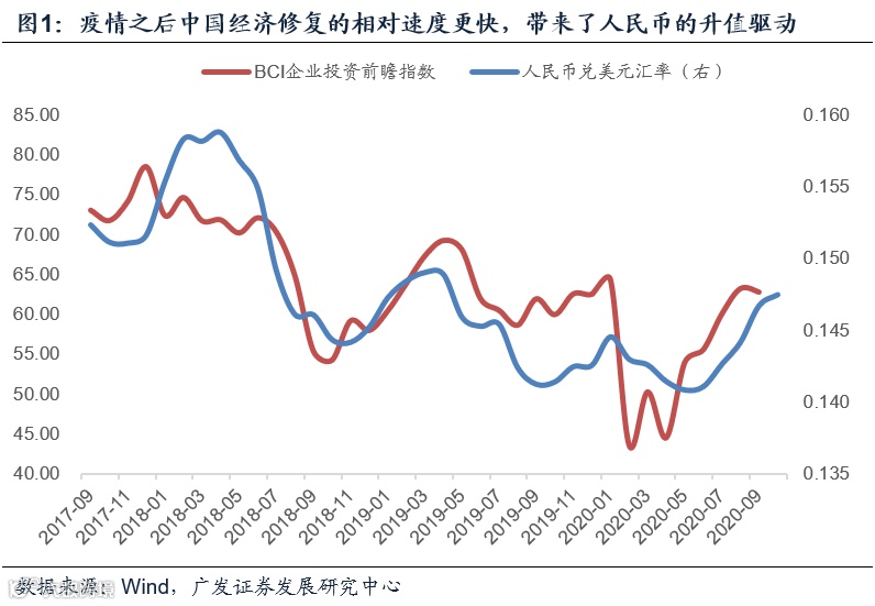 第一,疫情之后中国经济修复的相对速度更快,过程更连续,从而对汇率形成支撑。我们可以通过BCI与汇率的关系观测到这一过程。疫情给全球经济带来了冲击,疫后随着复工和经济重启,各国经济都进入了修复轨迹。中国复工始于3月下旬,欧美复工始于4月下旬。由于中国防控常态化阶段比较成功,基本没有疫情反弹,因此经济修复相对速度更快,过程也更连续。这带来了人民币的升值驱动。