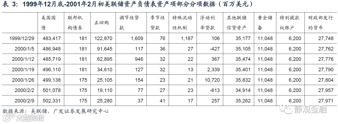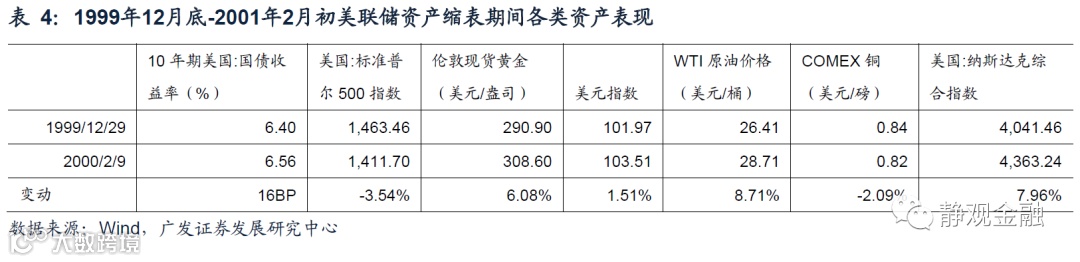 由于当前的结构性缩表属于短期政策退出,与2000-2001年两次缩表有相似之处。但“9.11”事件后美联储扩表操作只实施了1周便退出了短期操作,对当前的启发也比较有限。因此,有相对参考意义的或许是2000年初的缩表,由2000第一周持续到2000年2月9日当周。如表5所示,2000年初美联储缩表期间各类资产涨多跌少,并未引发市场大幅波动,且纳斯达克指数表现十分强劲,与过去一段时间如出一辙。然而值得注意的是,2000年2月美联储缩表结束后,纳斯达克也同步见顶。