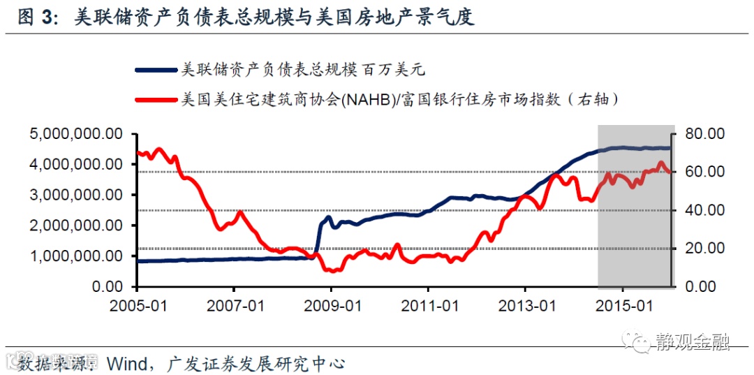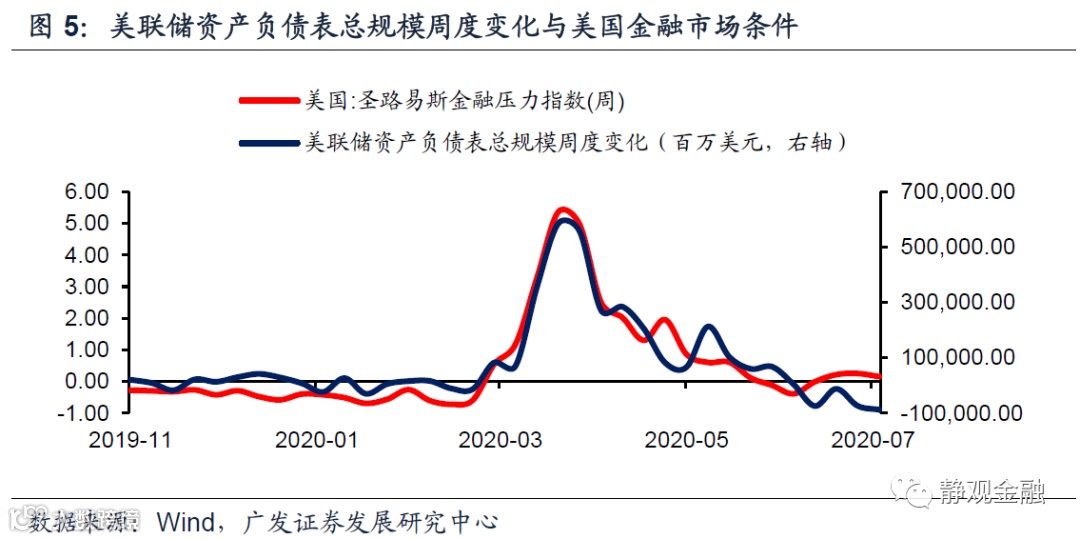 如图5所示,美联储资产负债表总规模周变化与美国金融市场条件指数(圣路易斯联储金融压力指数)高度正相关。也就是说,美联储扩表速率放缓甚至结构性缩表的同时,美国金融市场条件在不断改善。我们认为金融条件改善刚好就是美联储结构性缩表的原因。