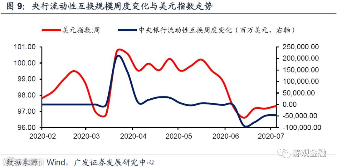 第三,央行流动性互换实则是降低海外美元流动性压力。美联储并不经常动用央行流动性互换操作,而3月底实施该操作刚好是美元指数有效破100的时点,可见其意图是缓解离岸美元流动性压力。但如图9所示,随着境外美元流动性压力缓解、美元指数高位回落,央行流动性互换这一临时性政策也就可以暂时功成身退了。