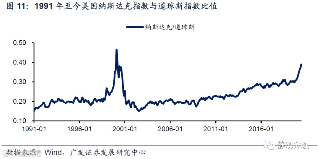我们认为,与当下类似,历史上美联储部分短期操作亦与金融市场条件有关。就2000年初的缩表而言,假若纳斯达克尚未见顶则缩表过程或将延续;极有可能是股市见顶信号导致美联储结束缩表。但也可以理解为美联储缩表引发的货币条件收紧是纳斯达克泡沫破灭的催化剂。审视当下,除了结构性缩表外,美股估值水平、纳斯达克与道琼斯比值反映的美股板块分化特征亦与1999-2000年初相似。我们担心美联储结构性缩表也将成为市场出现调整风险的催化剂。从时间点看,我们认为7月与11月极为关键。假若7月美国政府未能落地新一轮援助法案,则传统行业或受打击。参考《酝酿中的变化——海外宏观经济2020年中期展望》结论,假若拜登在11月3日美国大选中胜出,美股将迎来长周期风格切换,并有望以科技牛终结为美股风格切换的起点。