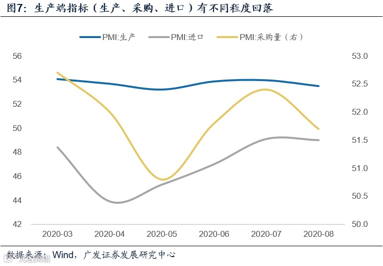 2)生产端指标(生产、采购、进口)不同程度回落。