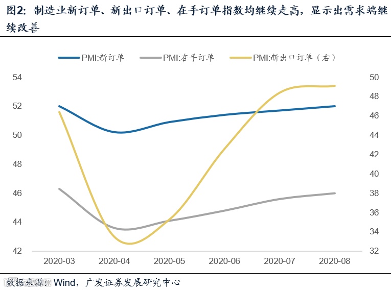 2)制造业新订单、新出口订单、在手订单指数均继续走高,显示出需求端继续改善。