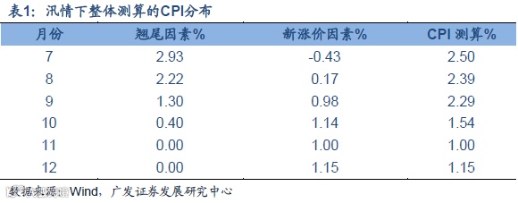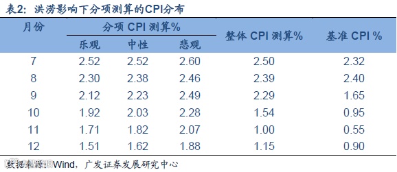 我们做了洪涝影响下的CPI三四季度分布详细测算,包含CPI三种情景假设分布(表1-表2)。