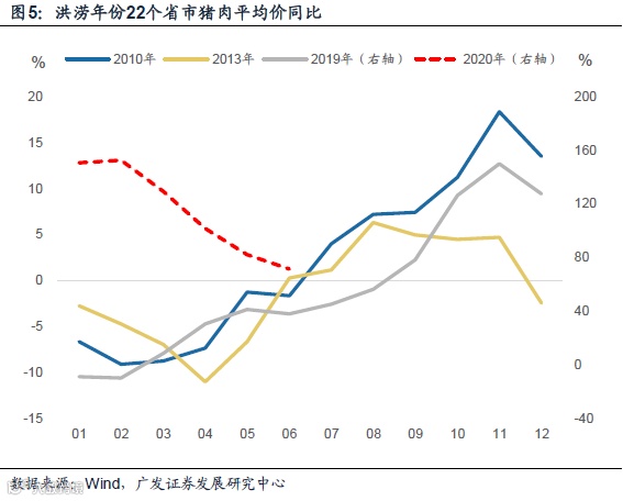 第一,雨季和洪涝对一般物价通胀的影响主要在猪肉、蔬菜以及粮食价格。