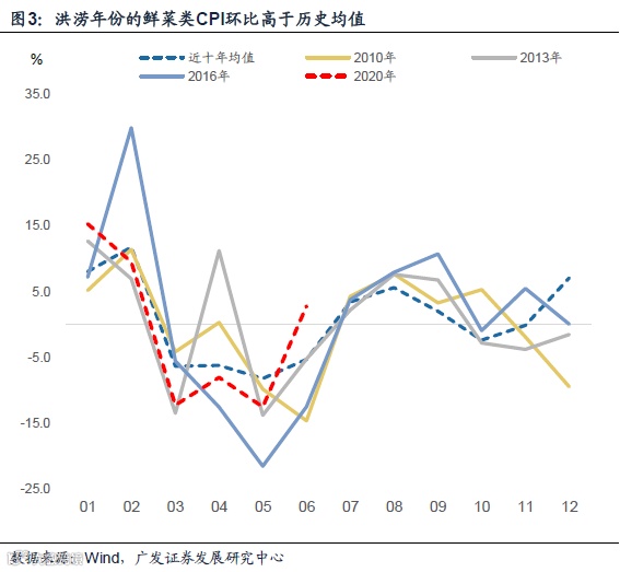 雨季和洪涝对于蔬菜价格的影响逻辑类似,附加的影响逻辑包括运输半径约束、及后续蔬菜大棚补种进度。历史上蔬菜价格超预期波动对于通胀扰动不容忽视,除2010年以外,雨季洪涝较为严重的时期(2013、2016年),5-8月蔬菜价格均出现阶段性上行。从2010年至今的三次洪涝进行观察,2016年三季度鲜菜价格环比超季节性。同期鲜菜价格主要受强降雨气候影响,生产和运输过程受阻,洪涝相对严重的安徽省全年蔬菜产量下降29%,7月其鲜菜价格环比上涨了16%,CPI鲜菜分项环比逐月上涨至9月的10.7%。今年持续强降雨已导致6月鲜菜类CPI超季节性上涨至2.8%(近十年6月鲜菜CPI环比均值为-6.6%),洪涝影响或进一步发酵。
